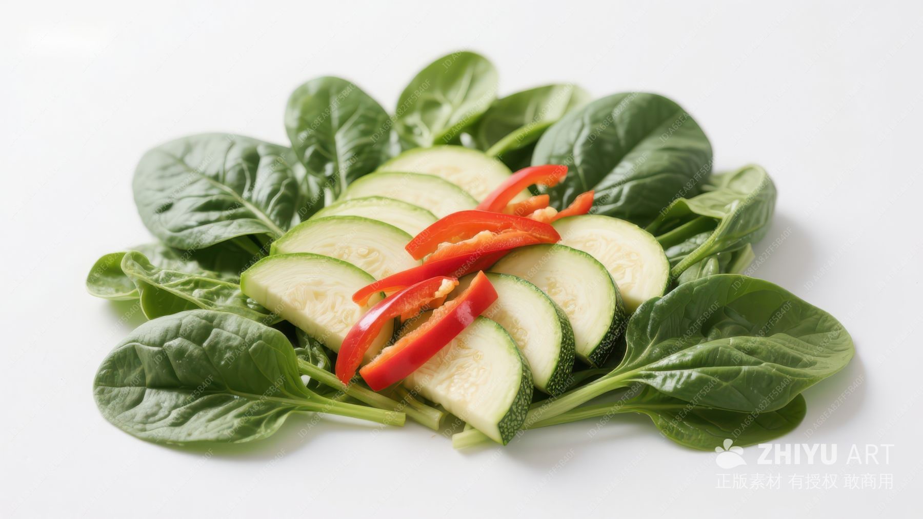 新鲜蔬菜组合:菠菜、黄瓜与红椒