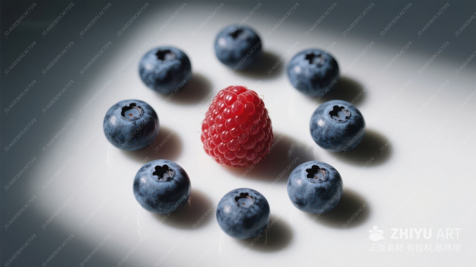 一圈覆盆子环绕一颗蓝莓