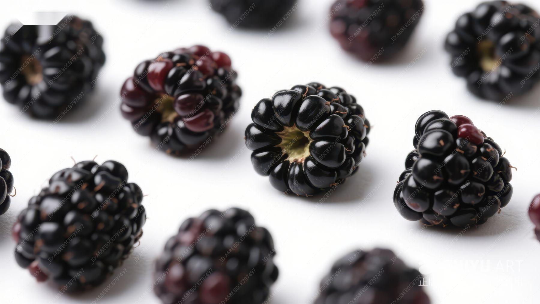 新鲜黑莓整齐排列于白色背景