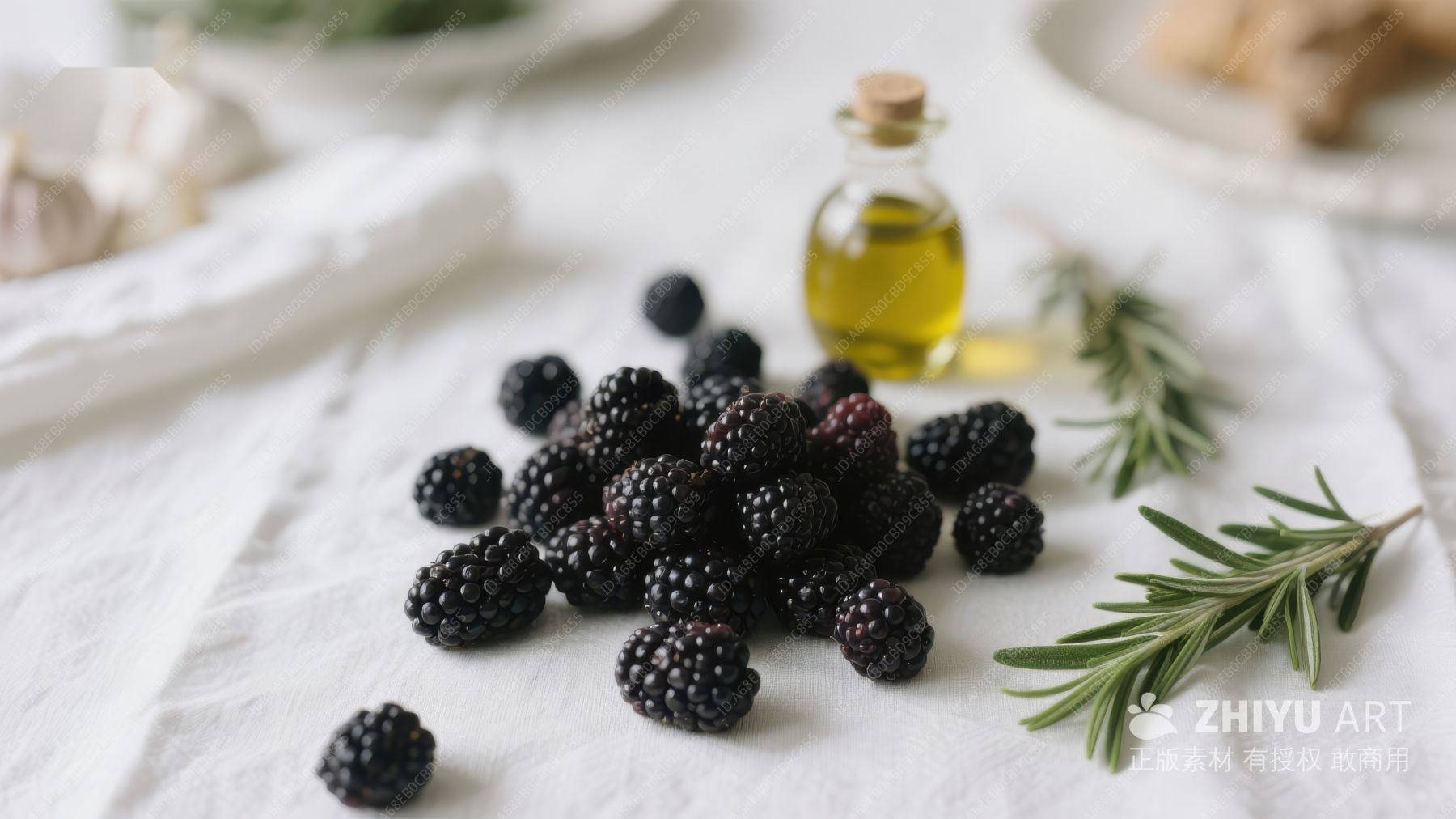 新鲜黑莓与迷迭香橄榄油的静物组合