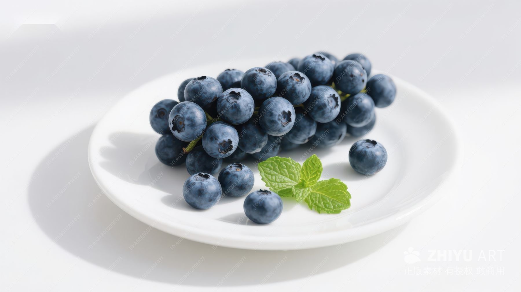 新鲜蓝莓与薄荷叶置于白色盘中 739