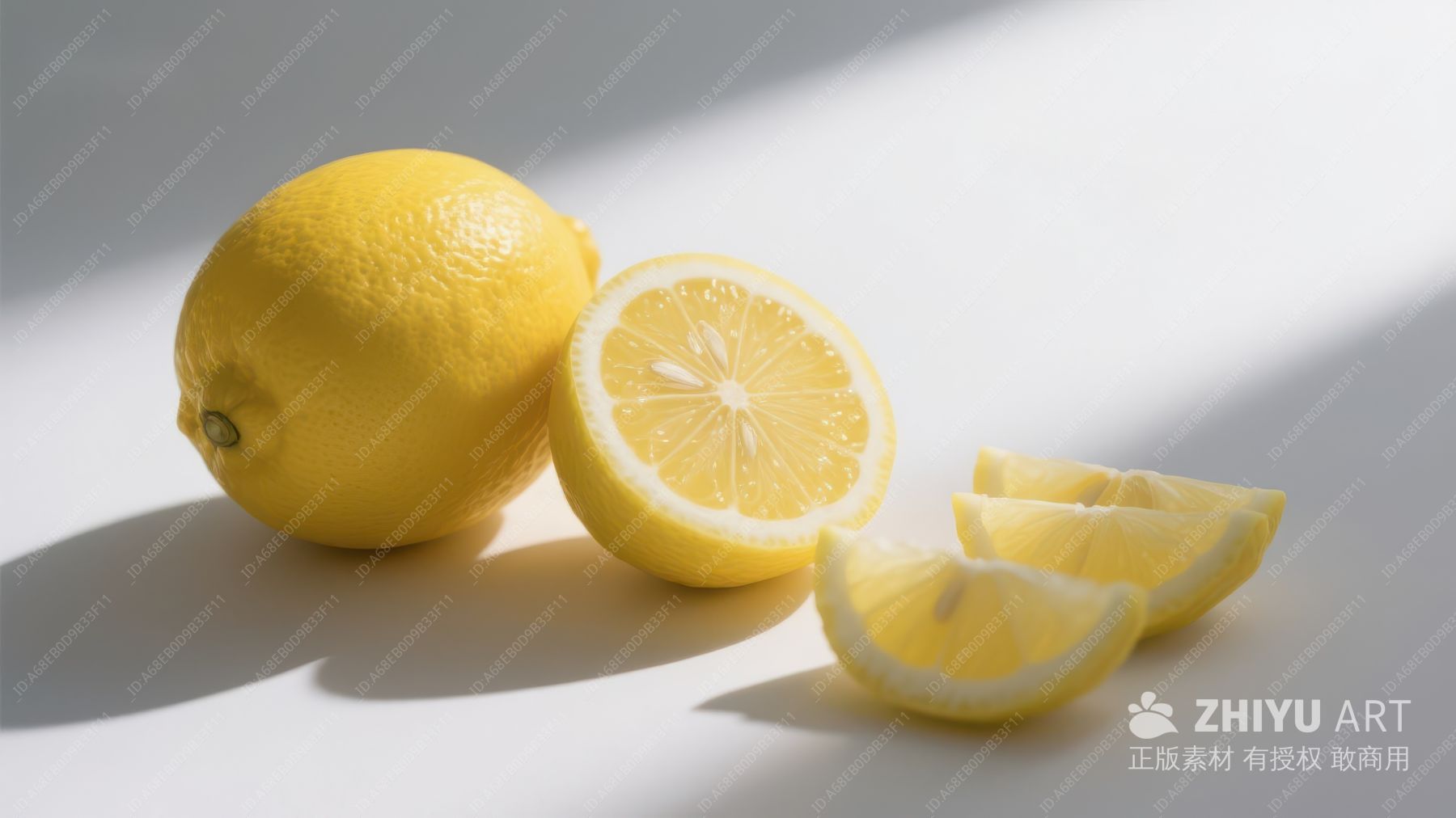 新鲜柠檬切片与完整柠檬的光影展示