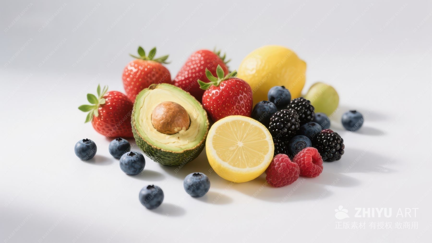 新鲜水果组合:牛油果、蓝莓、柠檬与草莓