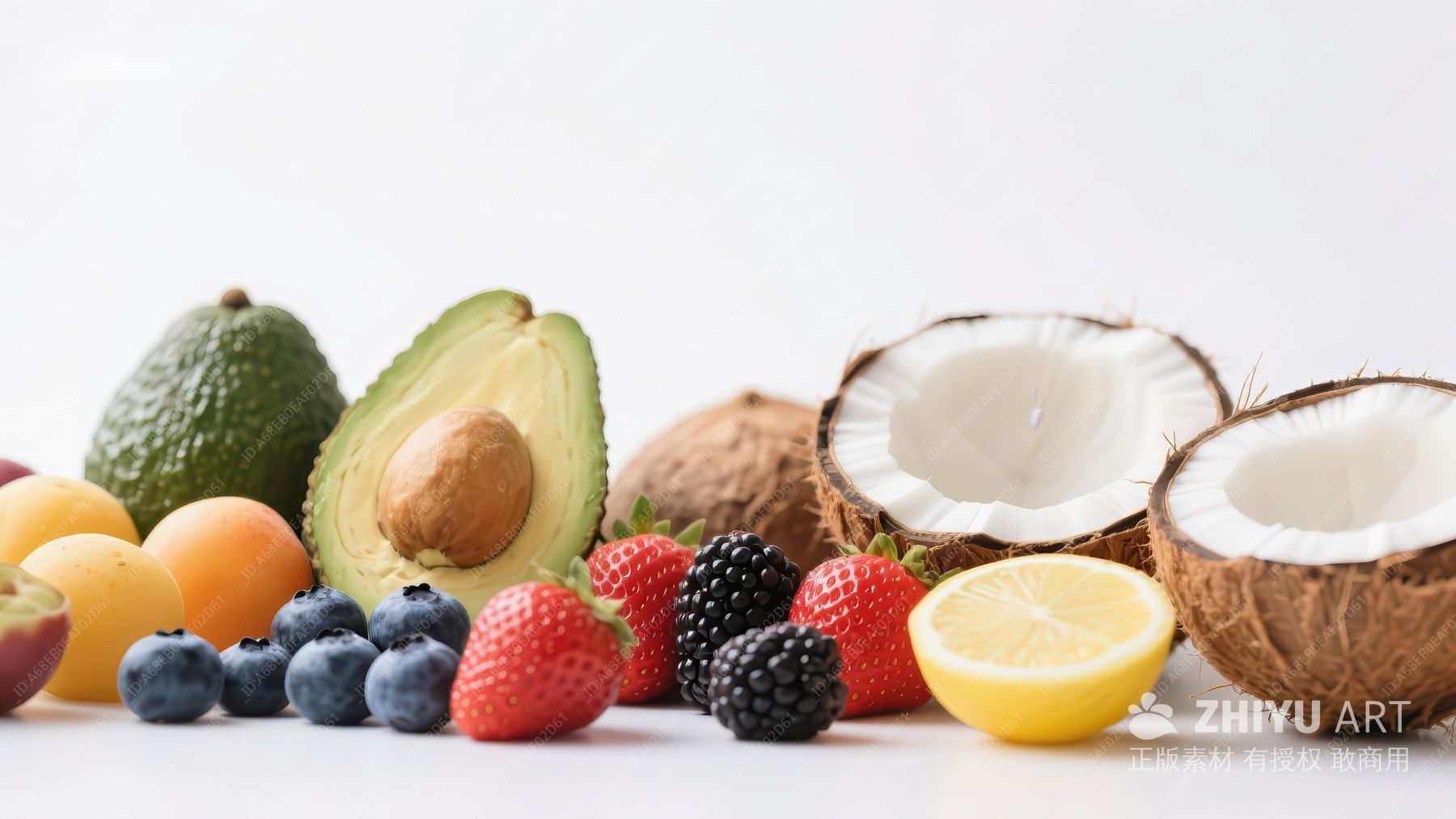 新鲜水果组合:蓝莓、柠檬、牛油果与椰子