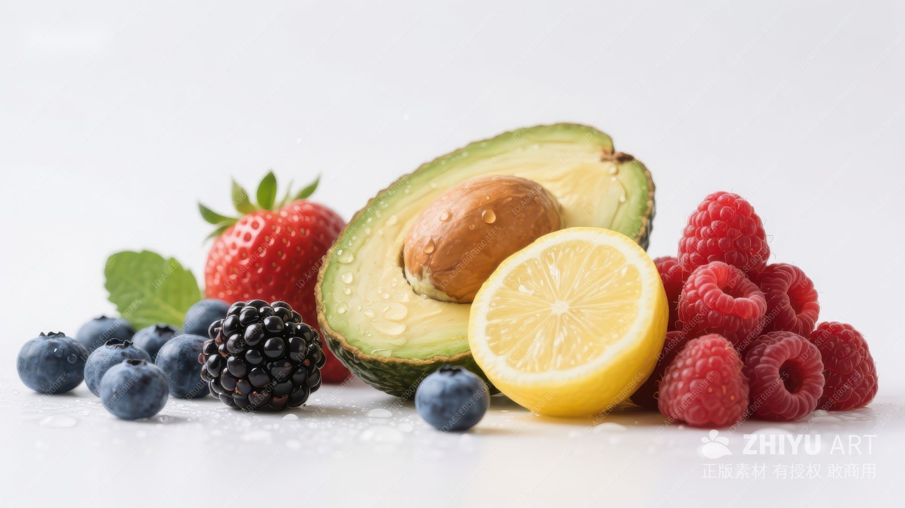 新鲜水果集合:草莓、蓝莓、柠檬与牛油果