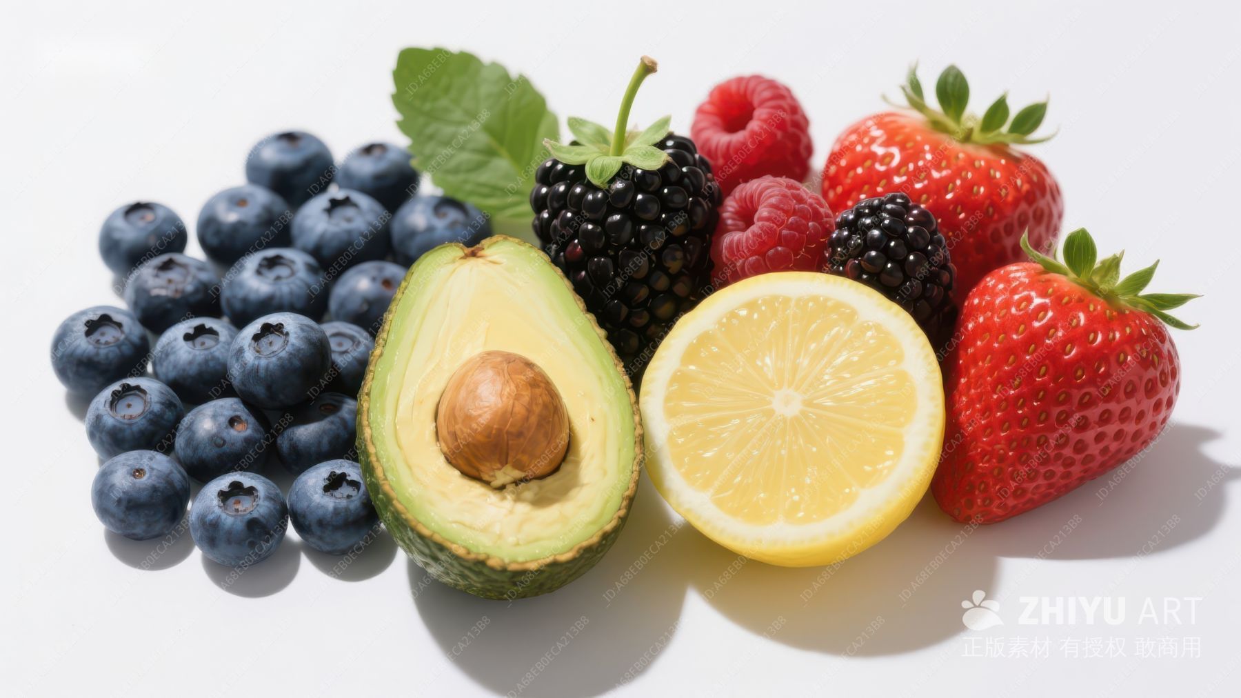 新鲜水果集合:草莓、蓝莓、柠檬与牛油果