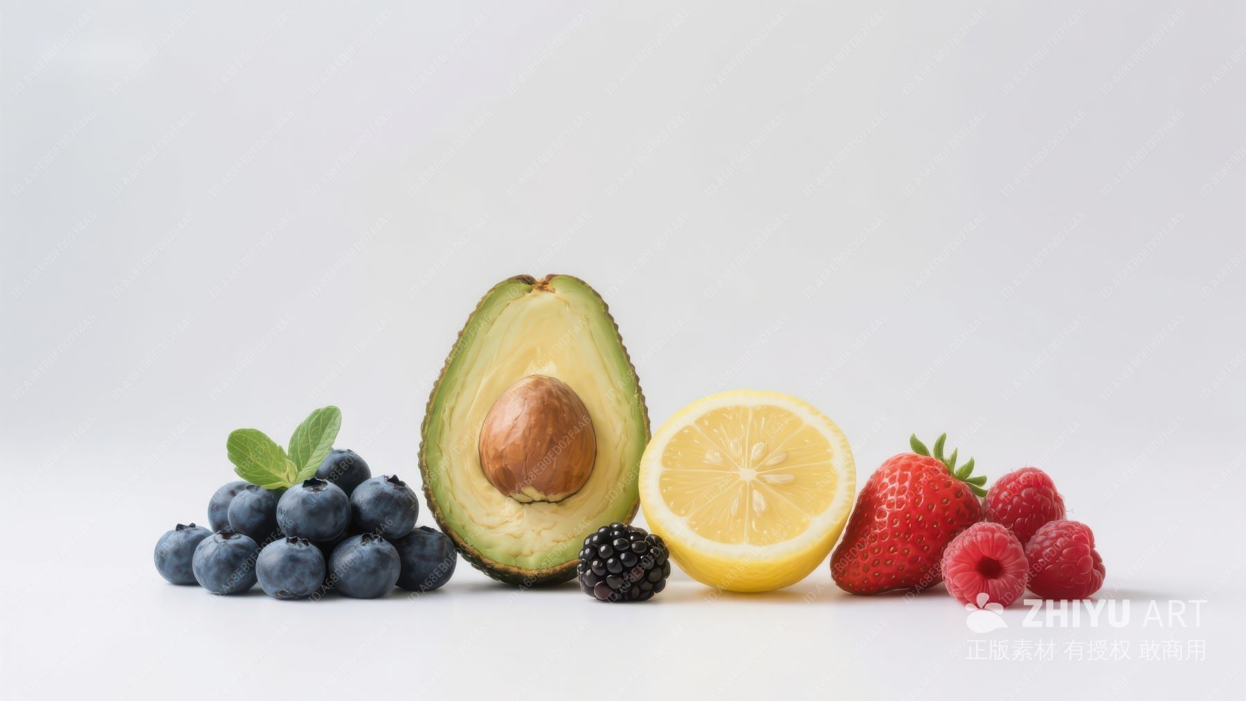 新鲜水果组合:牛油果、蓝莓、柠檬与草莓