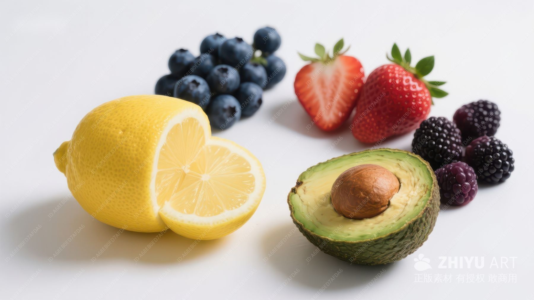 新鲜水果组合:柠檬、蓝莓、草莓、黑莓和牛油果