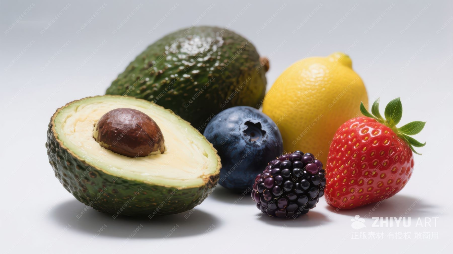 新鲜水果组合:牛油果、蓝莓、柠檬与草莓