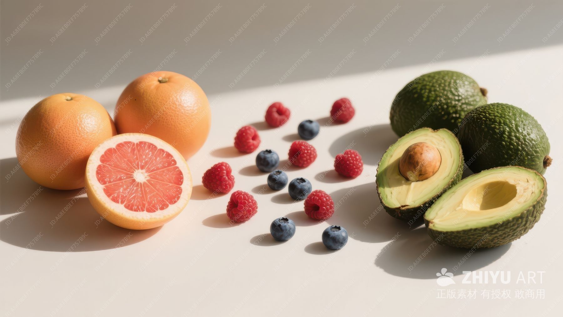 新鲜水果组合:葡萄柚、浆果与牛油果