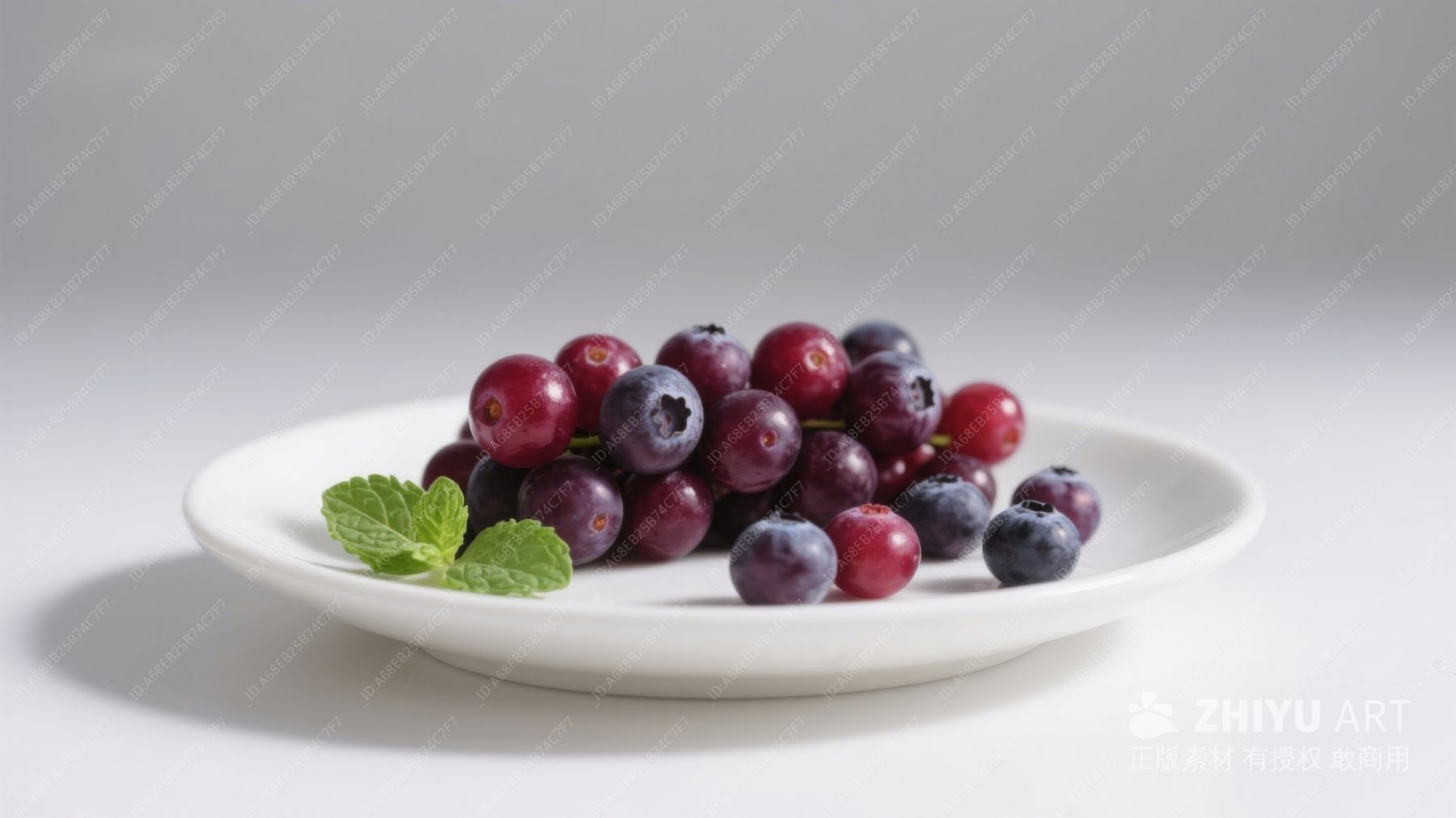 新鲜蓝莓与薄荷叶置于白色盘中 739