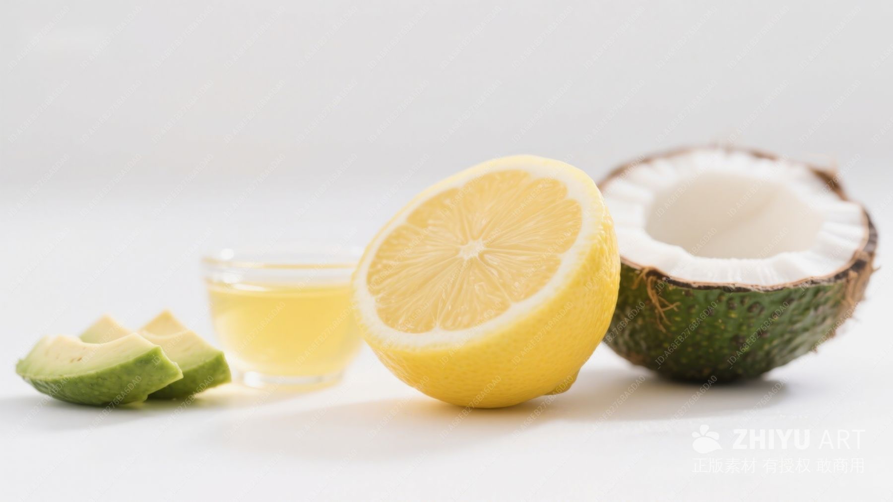 新鲜水果组合:蓝莓、柠檬、牛油果与椰子