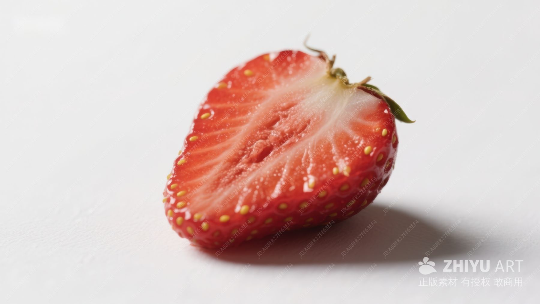 一颗被切开的草莓,露出白色的果肉和红色的外皮,上面