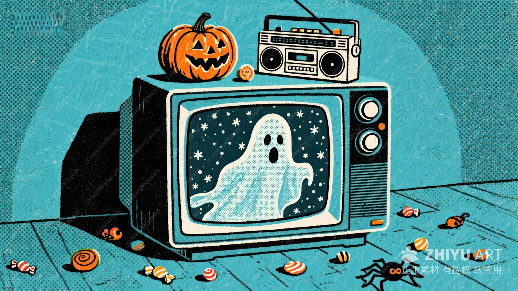 复古万圣节场景:骷髅、幽灵与南瓜灯