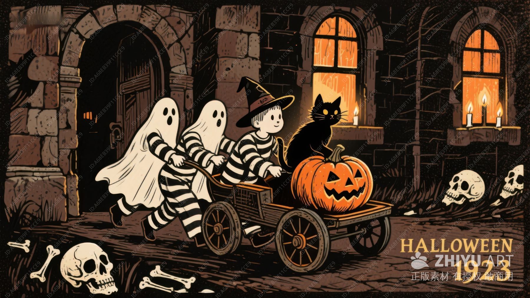 复古万圣节场景:骷髅、幽灵与南瓜灯