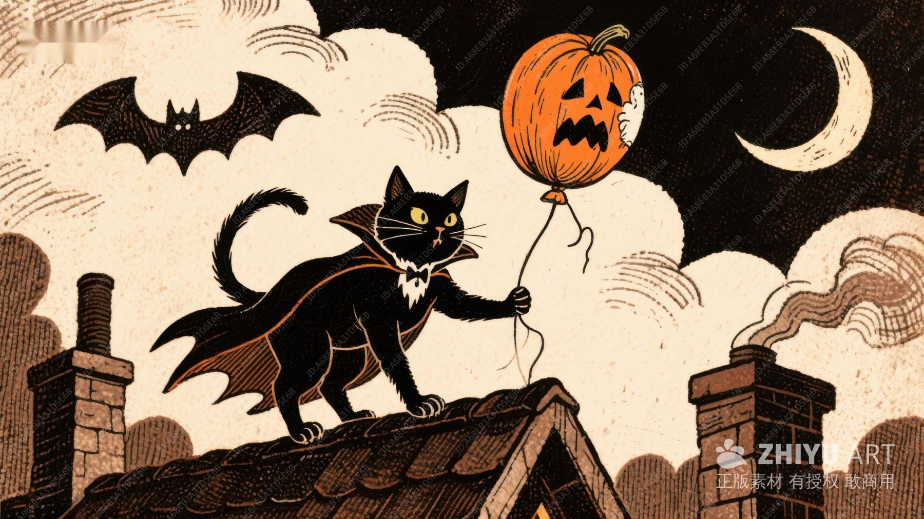 黑猫屋顶手握南瓜灯气球