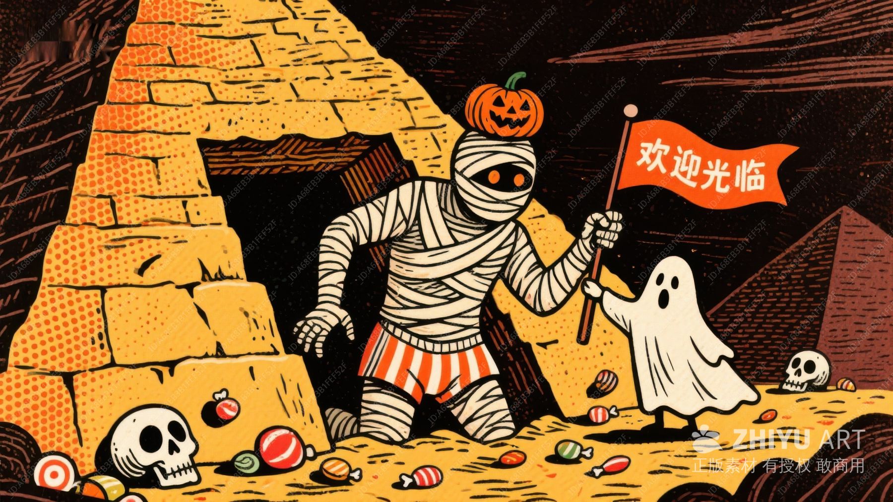 木乃伊与金字塔的万圣节场景