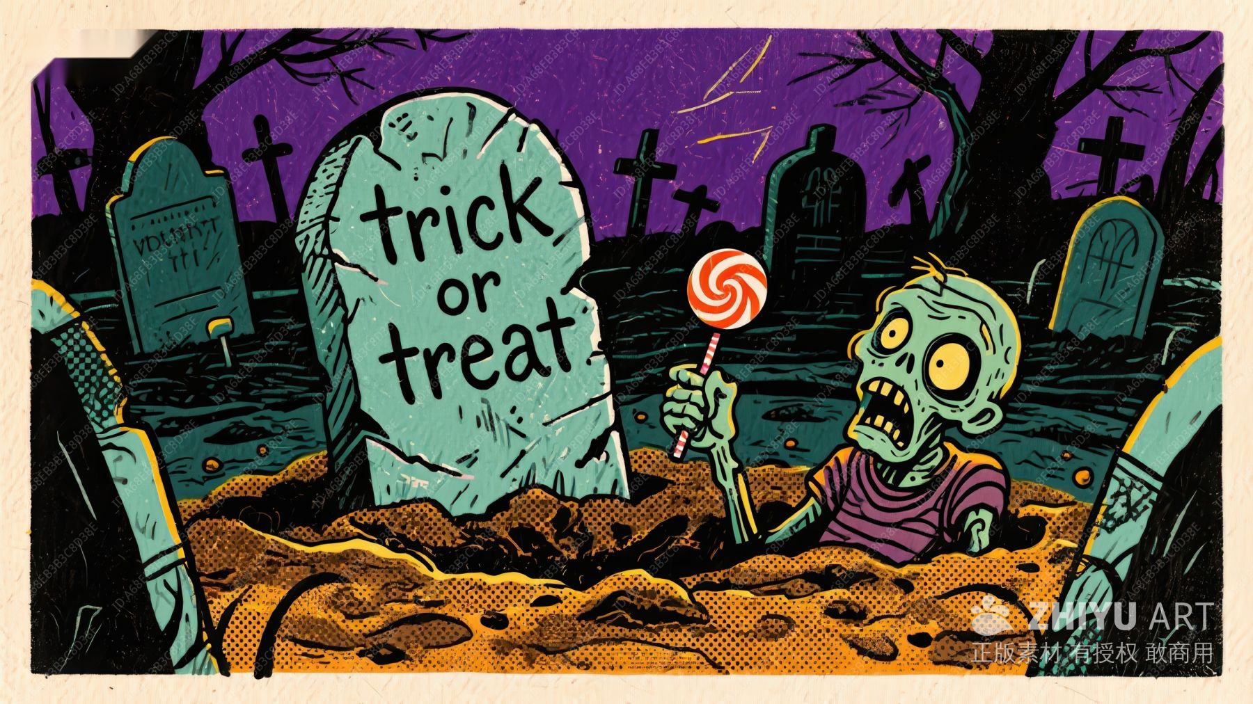 墓地僵尸手持糖果,石碑上书“不给糖就捣蛋”