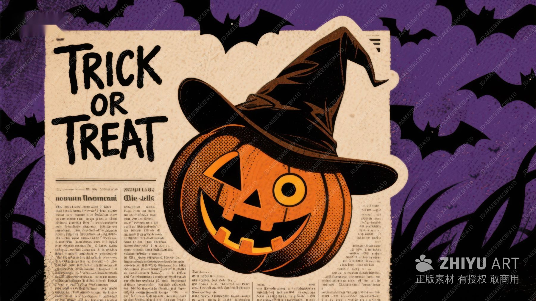 万圣节南瓜巫师手持‘不给糖就捣蛋’标语