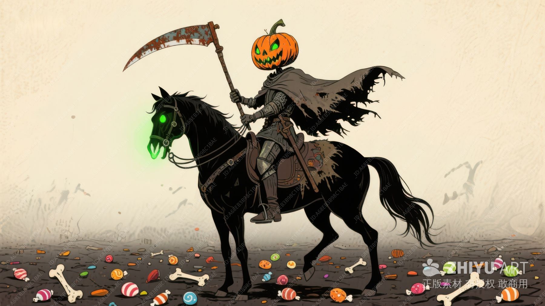 骷髅骑士持剑守门,南瓜灯城堡夜景