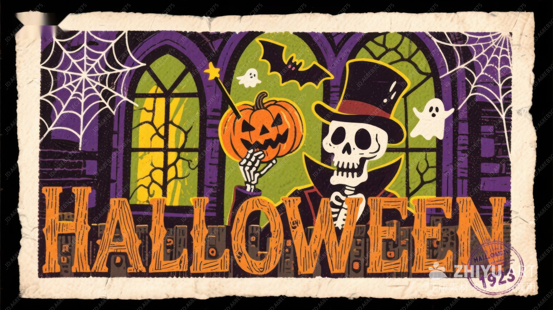 骷髅绅士手持南瓜灯,万圣节主题插画