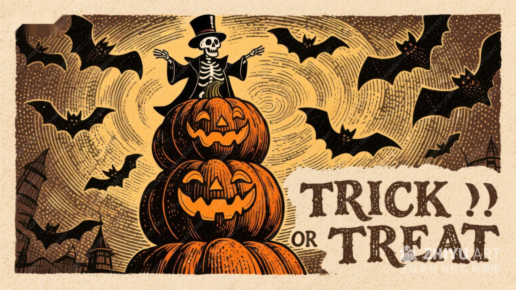 骷髅绅士手持南瓜灯,万圣节主题插画