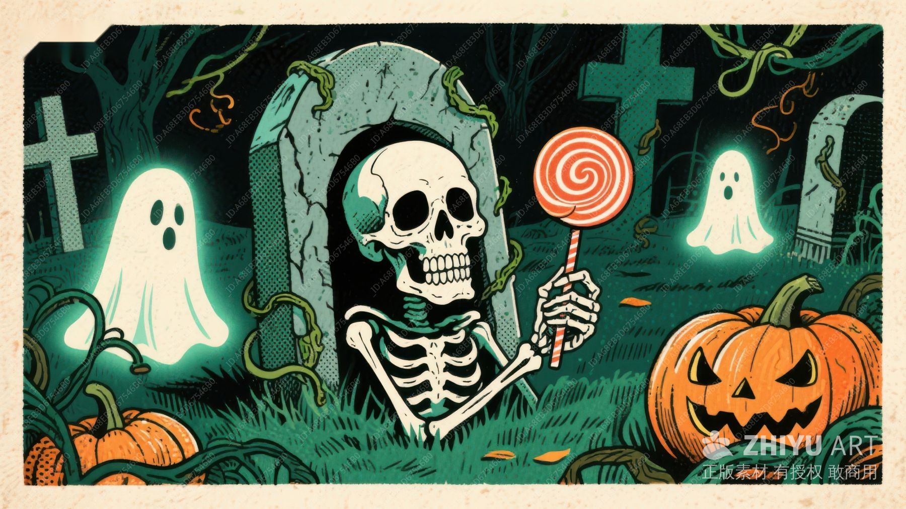 墓地中的骷髅手持棒棒糖