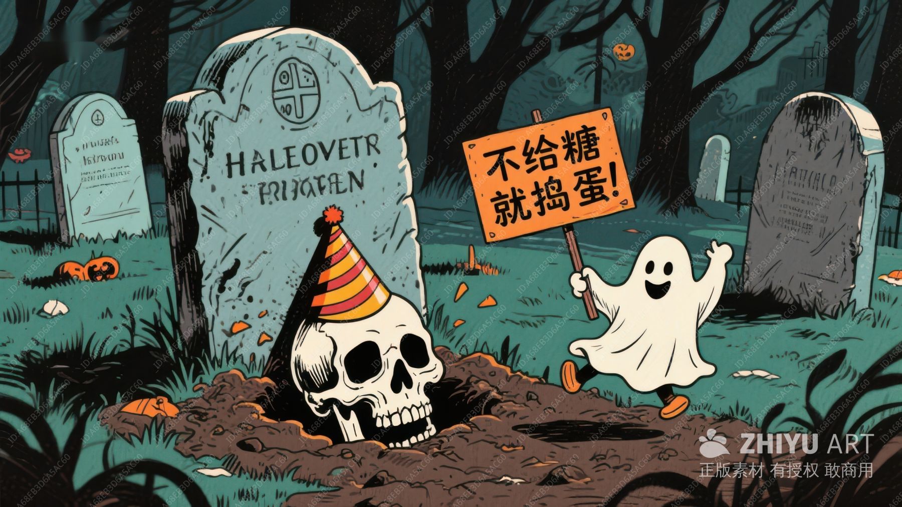万圣节墓地夜景:骷髅与幽灵的趣味互动