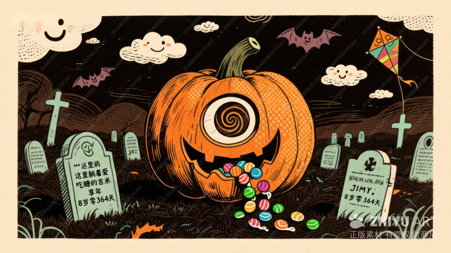 万圣节夜景:墓地里的南瓜灯与幽灵