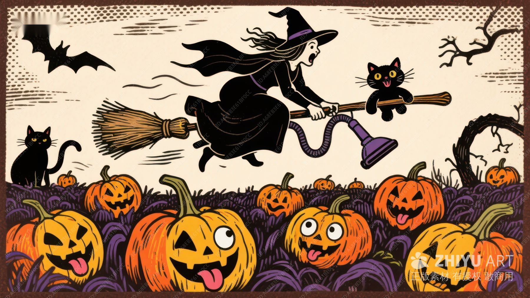 万圣节2023:女巫骑扫帚飞过南瓜地