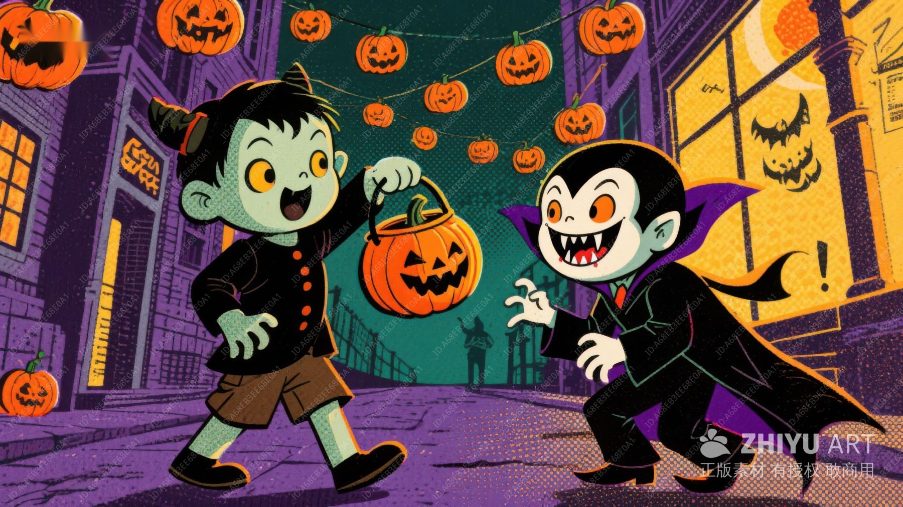 万圣节夜晚,小吸血鬼与木乃伊讨糖