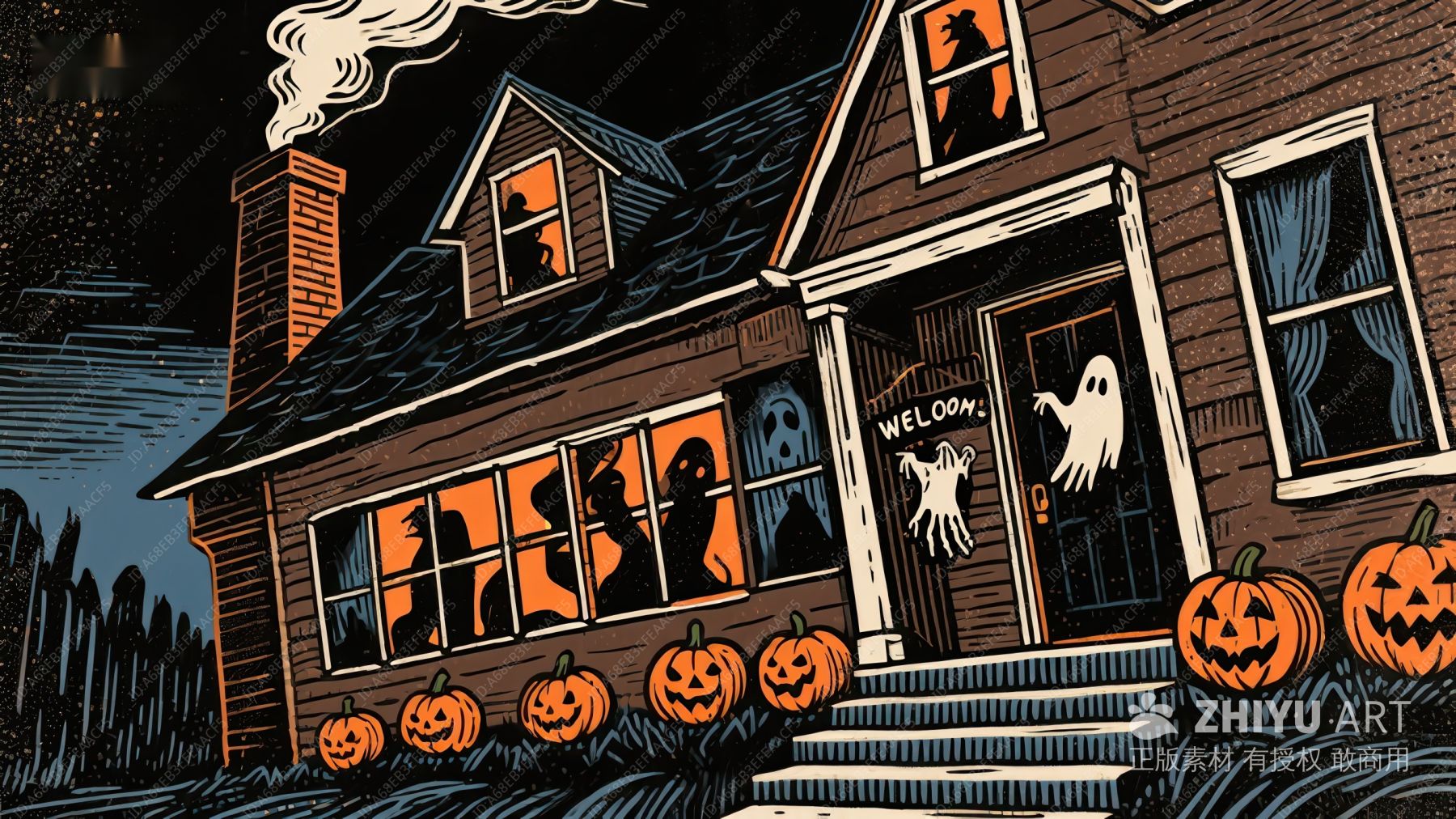 万圣节夜景:鬼屋、幽灵与南瓜灯