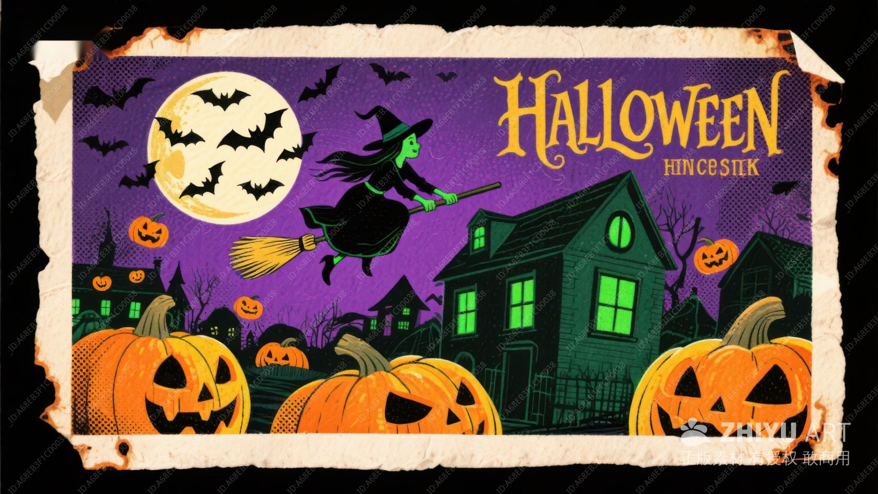 万圣节夜景:鬼魂、女巫与南瓜灯
