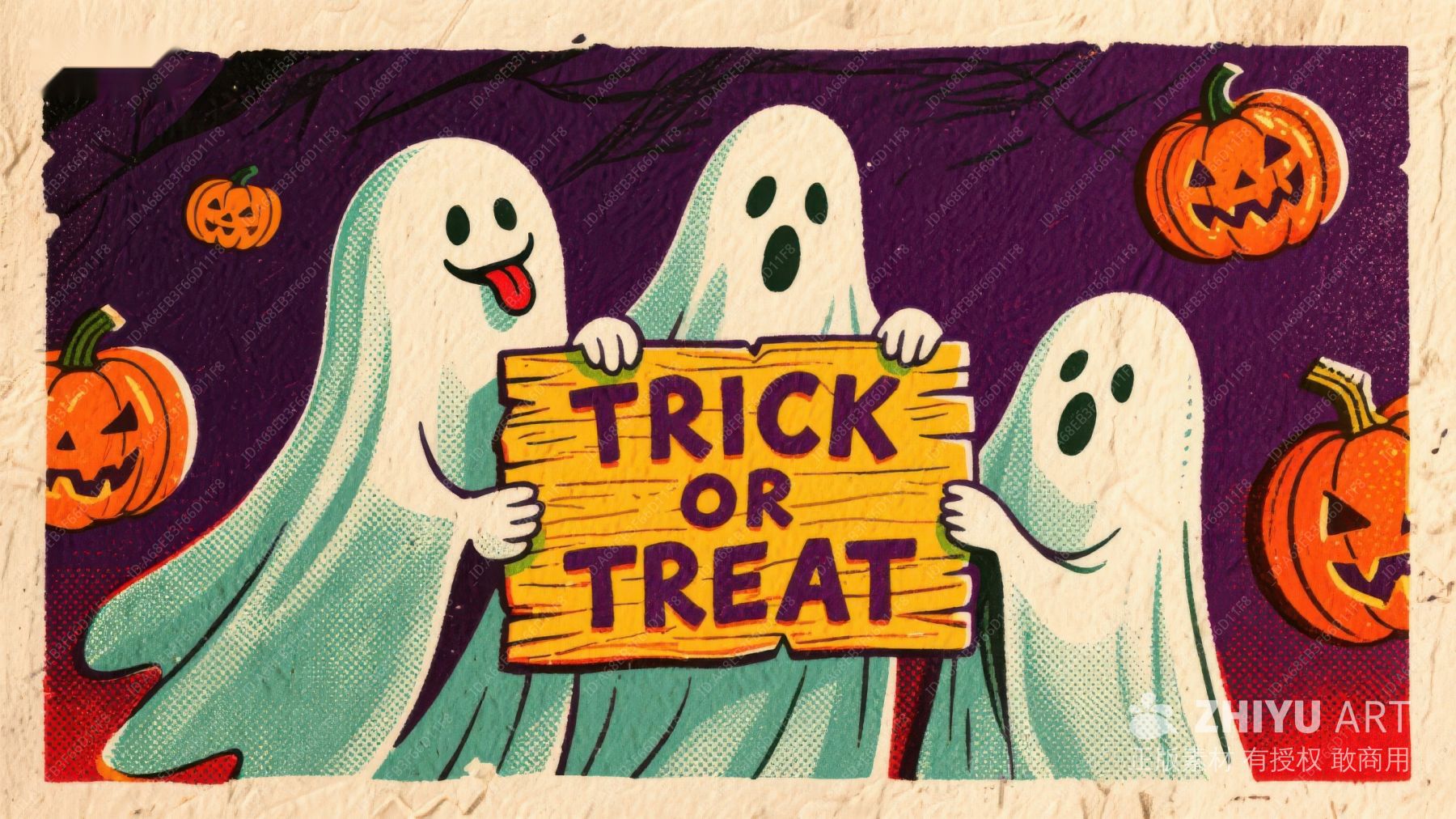 万圣节幽灵手持“不给糖就捣蛋”标语