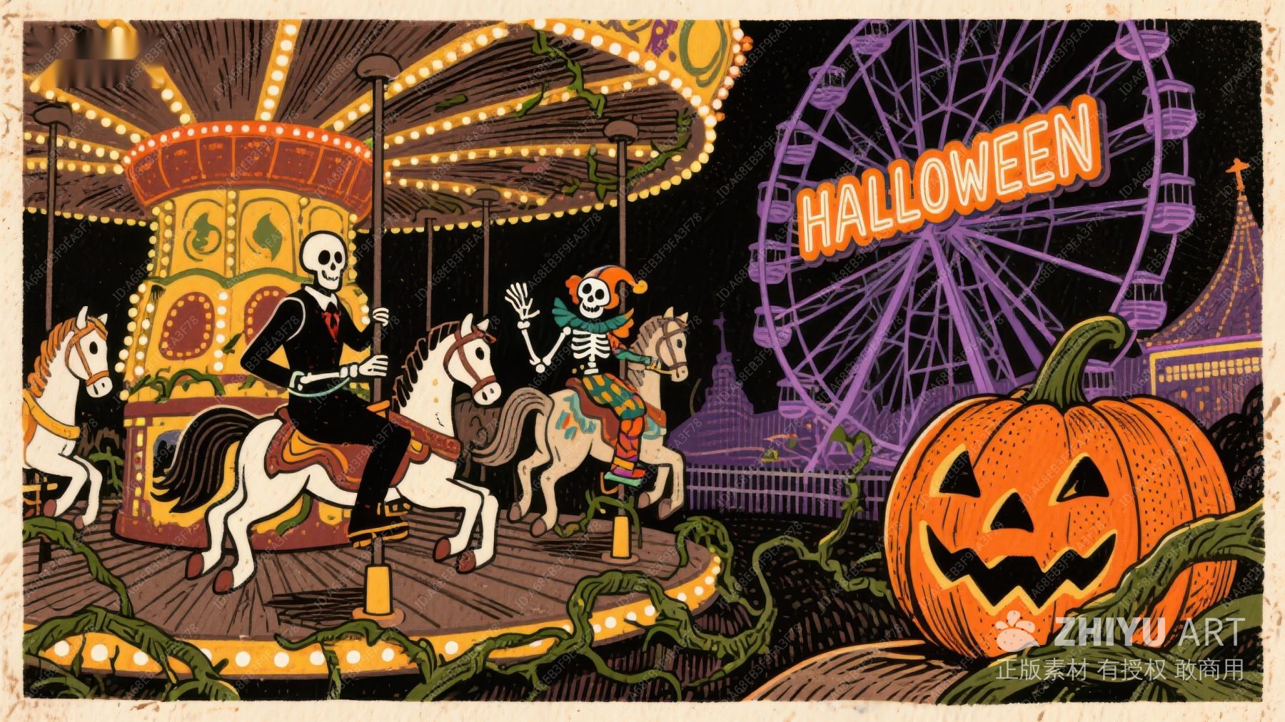 骷髅骑马夜游墓地,万圣节氛围浓厚