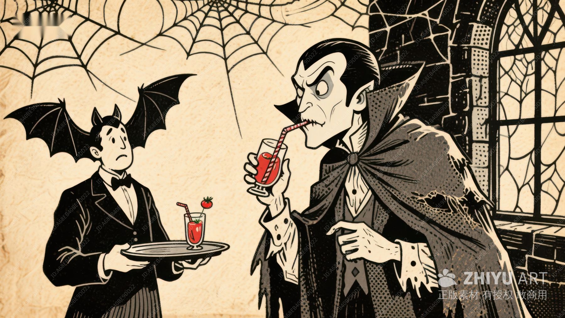 吸血鬼享用鸡尾酒,蝙蝠侍者在一旁