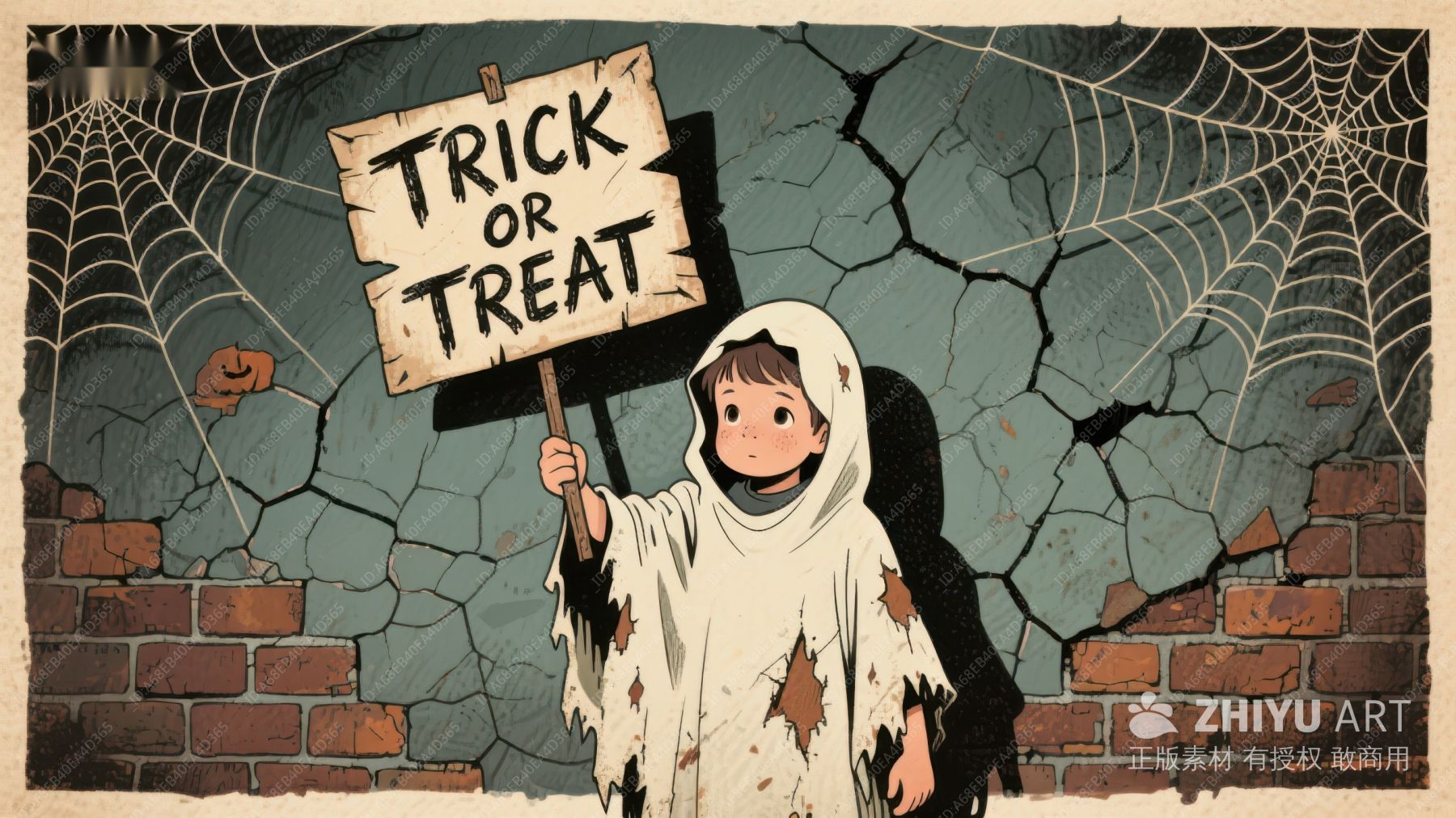 万圣节幽灵手持“不给糖就捣蛋”牌子