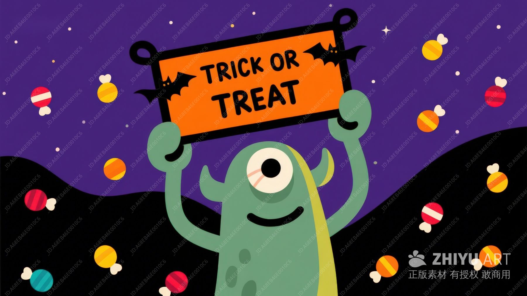 万圣节骷髅手举“不给糖就捣蛋”牌子