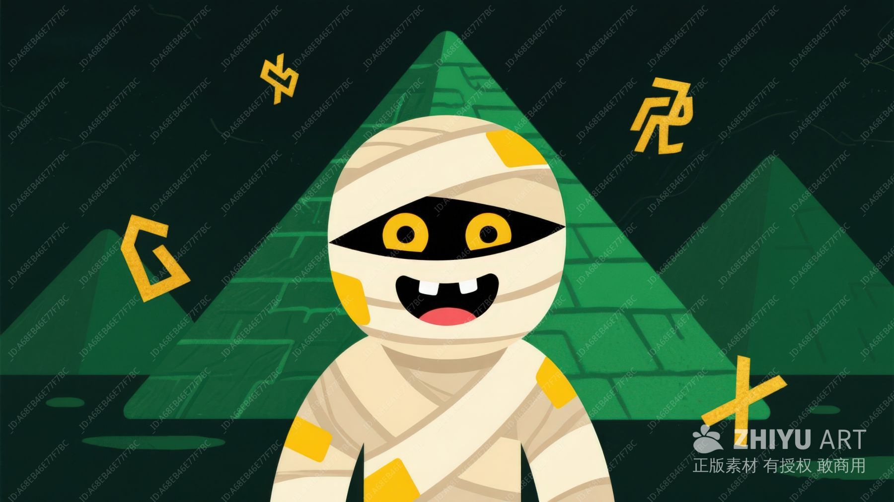 木乃伊手持棉花糖,背景为金字塔与古宅