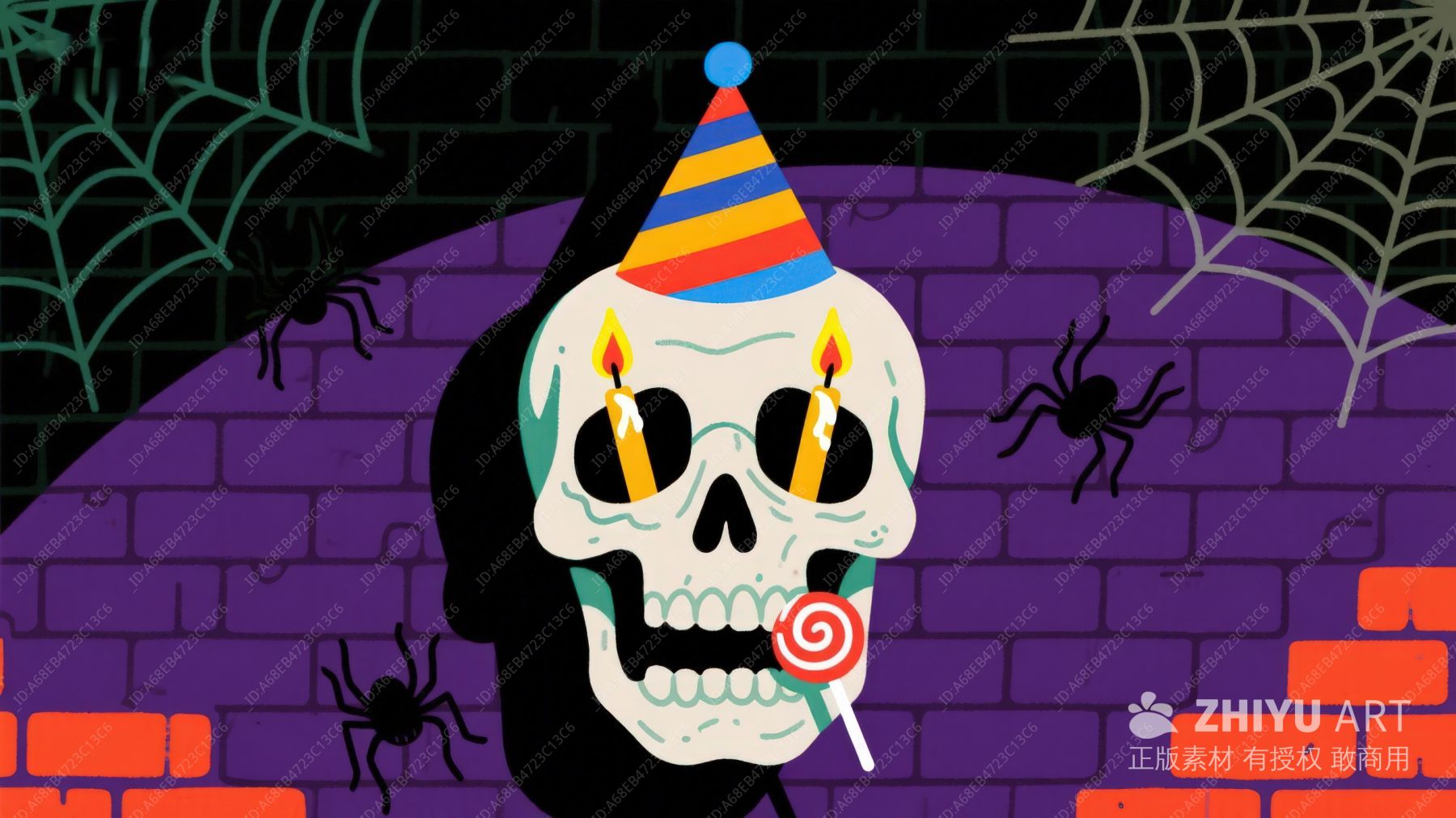骷髅手持糖果棒,背景蝙蝠飞舞