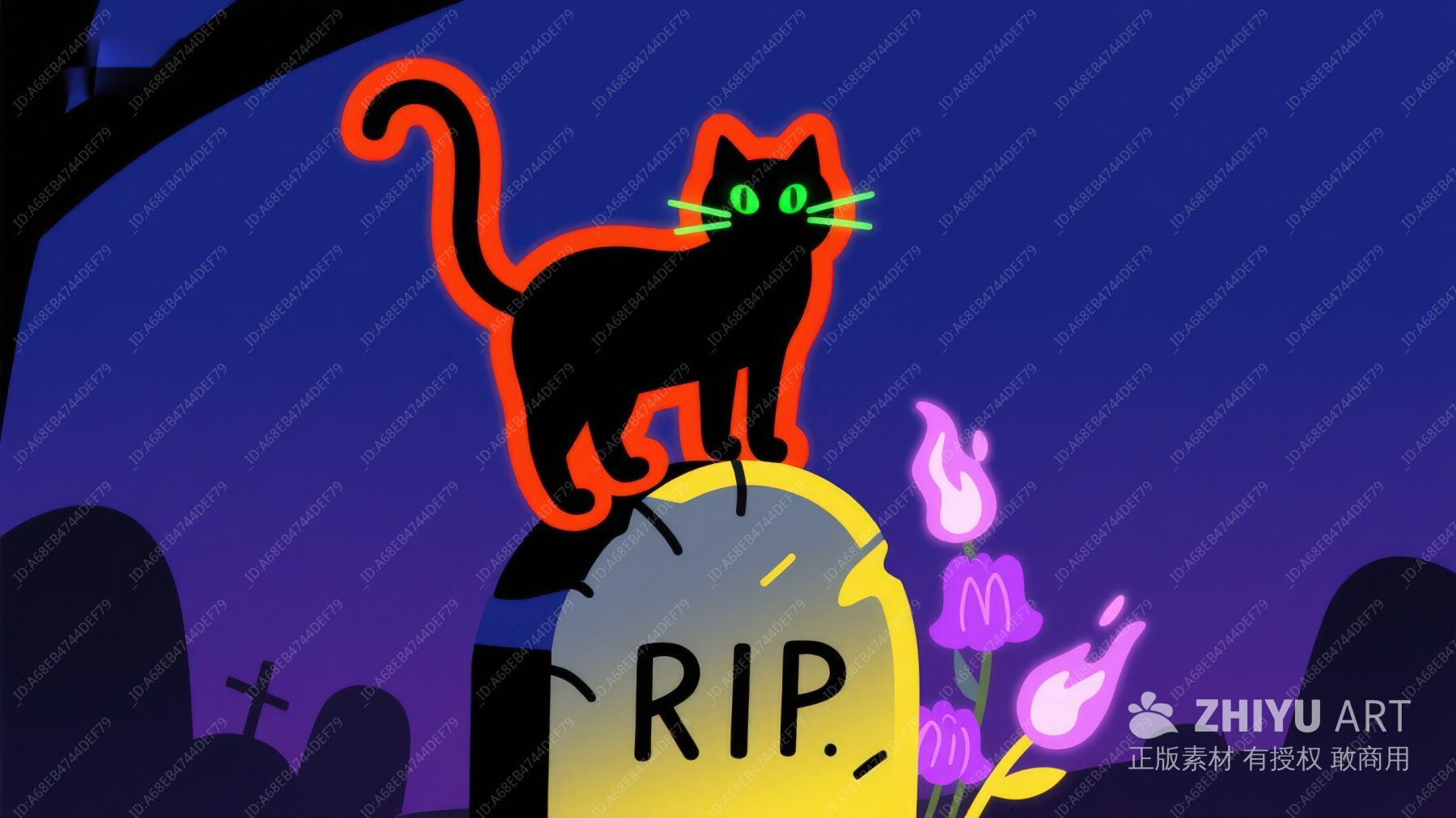 万圣节夜景:黑猫与墓碑