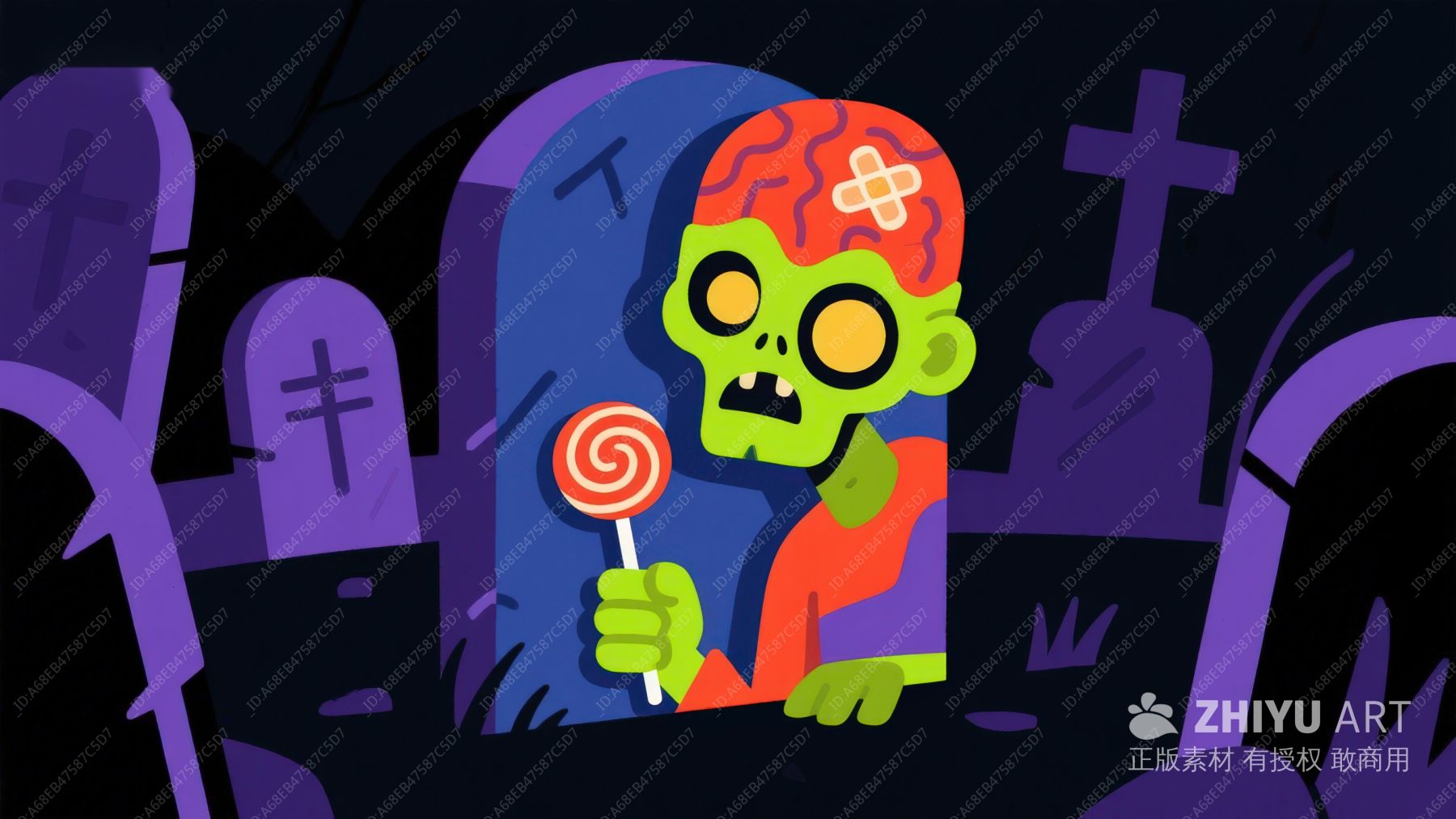 墓地僵尸手持糖果,石碑上书“不给糖就捣蛋”