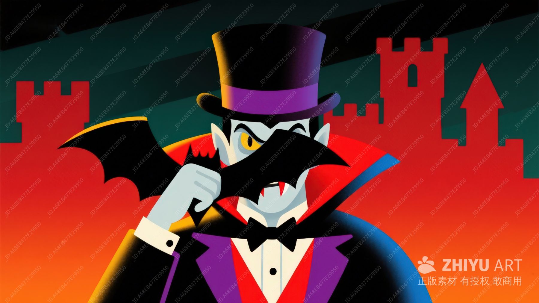 吸血鬼手持酒杯,背景蝙蝠环绕