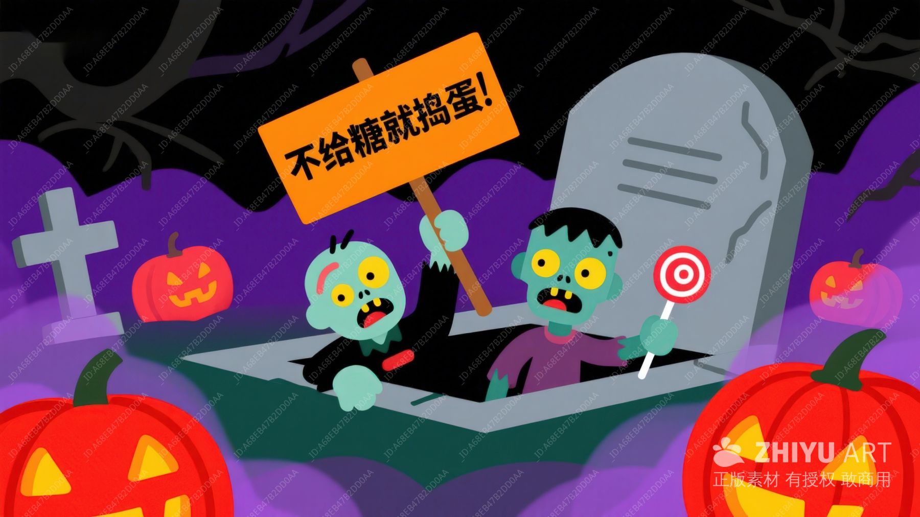 墓地僵尸手持糖果,石碑上书“不给糖就捣蛋”