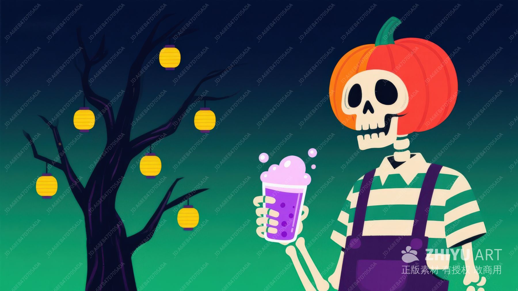 骷髅庆祝万圣节,手持南瓜蛋糕