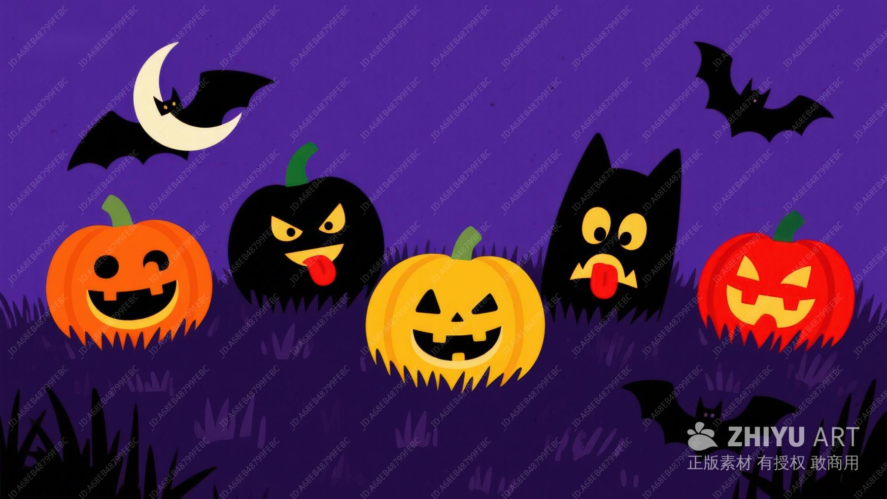万圣节南瓜灯与幽灵蝙蝠夜景