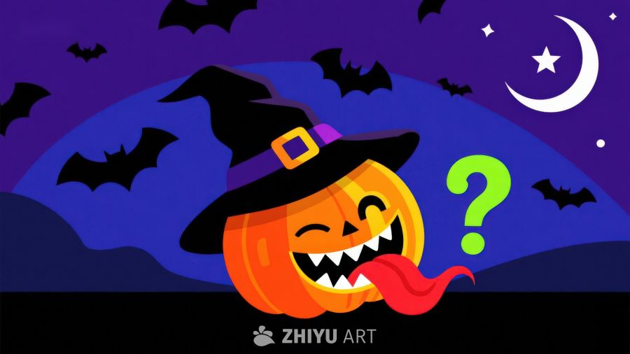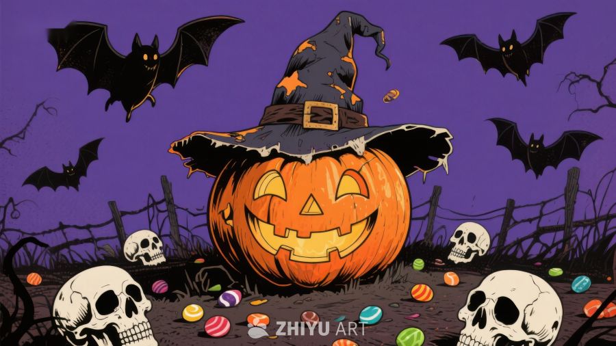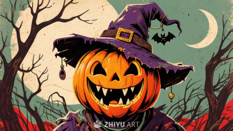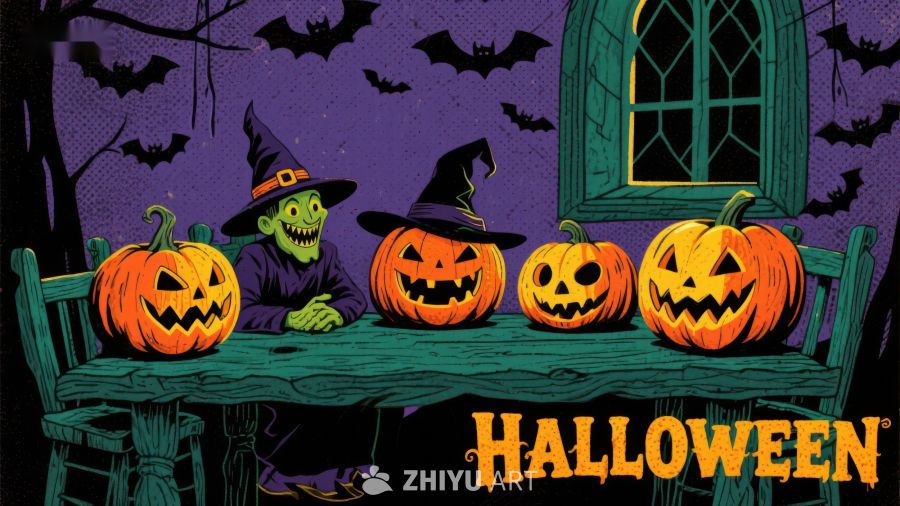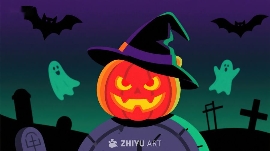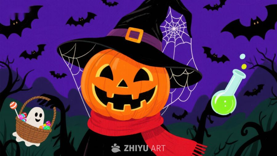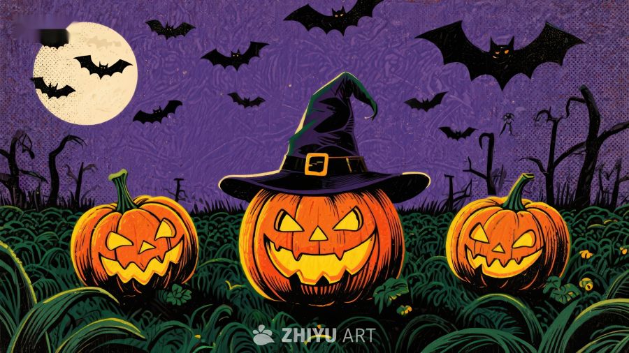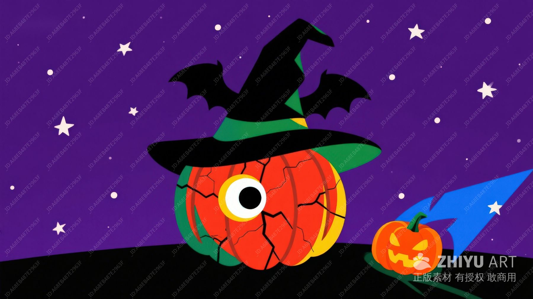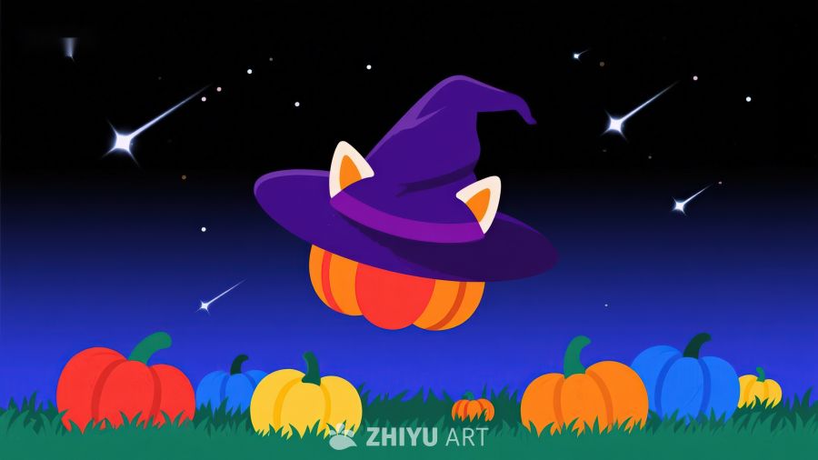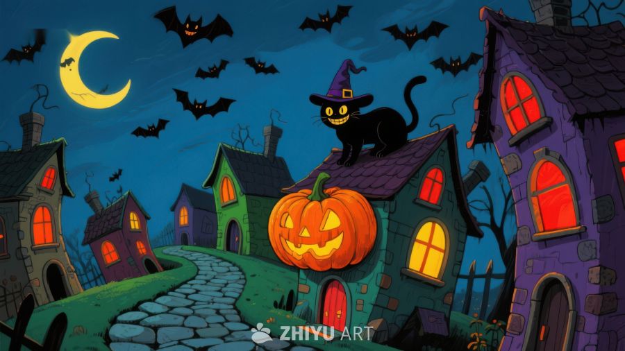万圣节夜景:南瓜灯与巫师帽黑猫