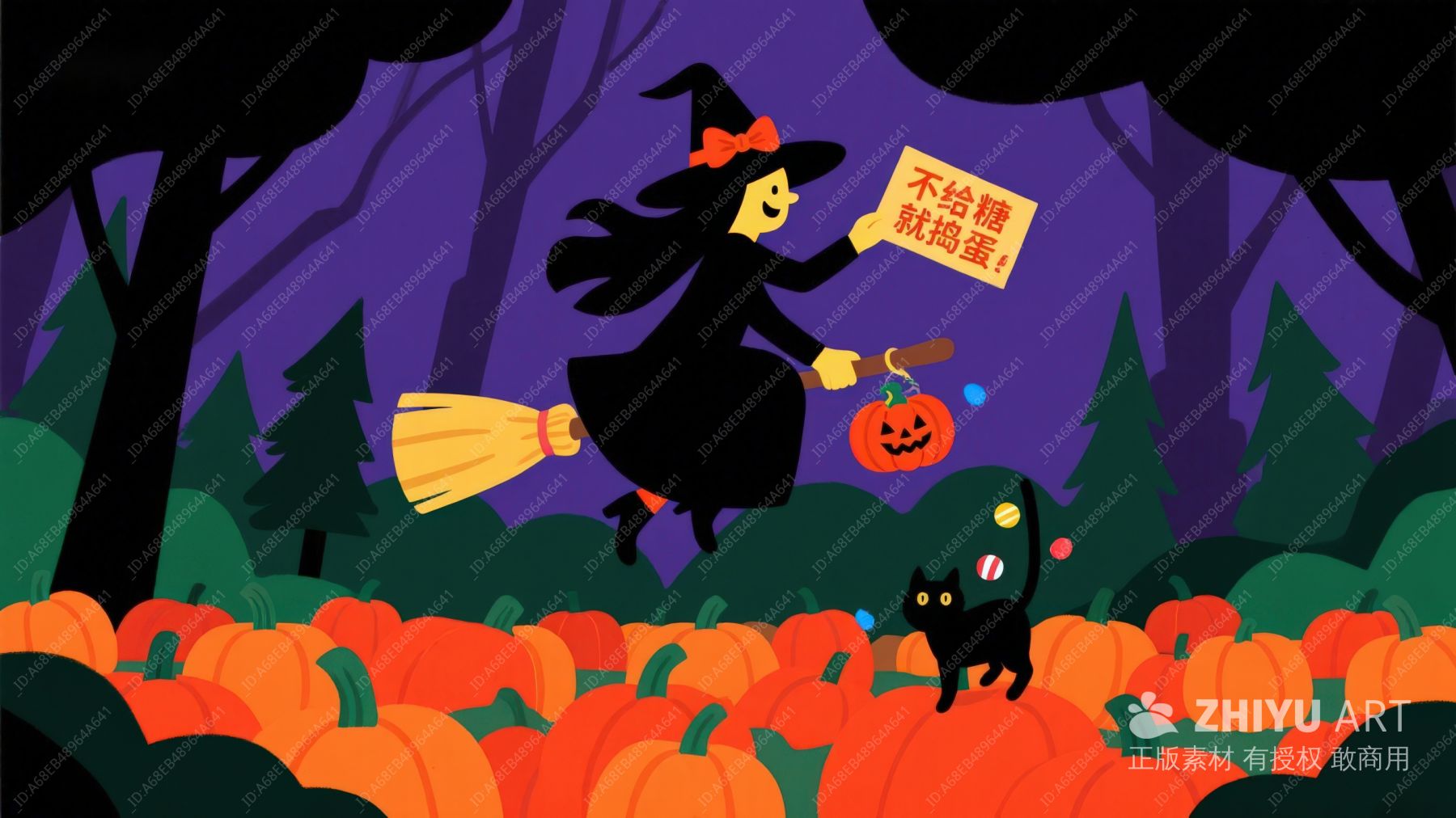 万圣节女巫骑扫帚飞过南瓜灯小镇