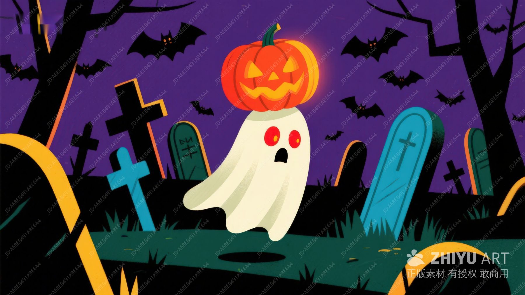 万圣节夜景:墓地里的南瓜灯与幽灵