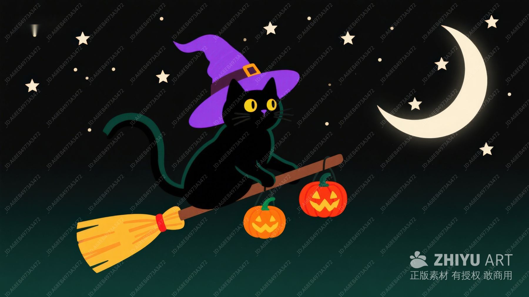 万圣夜猫巫骑帚,鬼魂南瓜映古堡